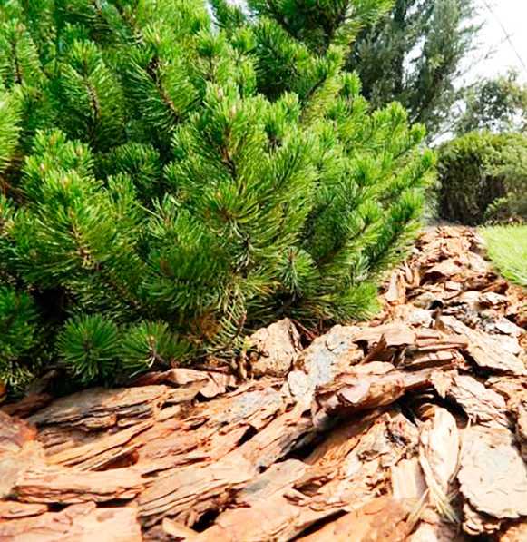 Кора сосны защищает почву от перегрева, промерзания, пересыхания, при этом сохраняет доступ кислорода к почве. Мульча сосны отпугивает запахом многих вредителей, обладает антибактериальным свойствами. Перегнивание происходит не очень быстро, спустя 2-3 года. Хорошо мульчировать посадки корой сосны по осени для защиты от промерзания. поскольку при производстве обрабатывается от короеда является безопасным материалом для мульчирования почвы хвойников.